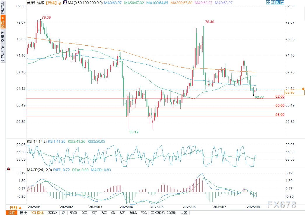 Pepperstone激石——自7月高点以来,油价已下跌近10%。欧佩克(OPEC)增产,以及特朗普与普京会谈可能降低对俄罗斯石油制裁的预期,均对原油价格构成压力。周线图走势表明,在形成周期低点之前,油价可能还有更多下行空间。